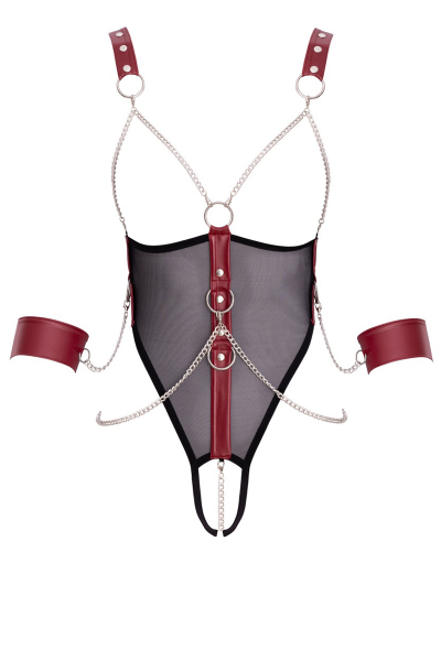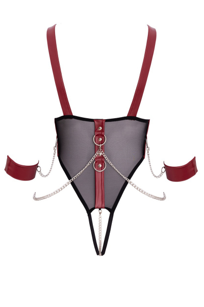Cottelli Bondage présente ce magnifique Body ouvert à l'entrejambe et aux seins nus proposé avec ses menottes souples amovibles.